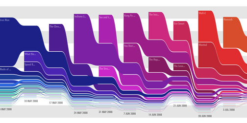 /Movie Box Office Charts are illustrations created by Zach Beane. Each chart tracks a year's worth of movies, showing the top 25 movies for every weekend. The movies from each week are color coded, allowing you to easily track how long the movie stayed in the charts and how its ranking changed over time. (Found through Neoformix).